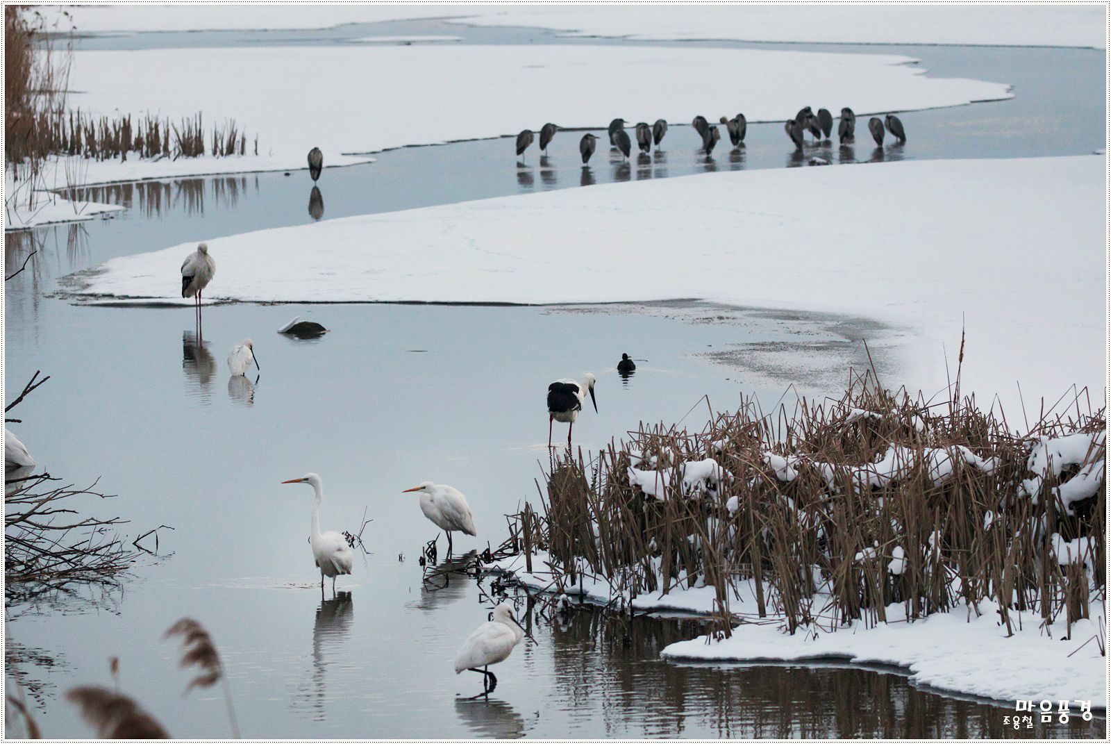 흰 눈 쌓인 개천 물길 위에 황새·노랑부리저어새·왜가리·백로가 평화로이 쉬고 있다. 렌즈 100~400mm, iso1000, f6.3, 1/500초.