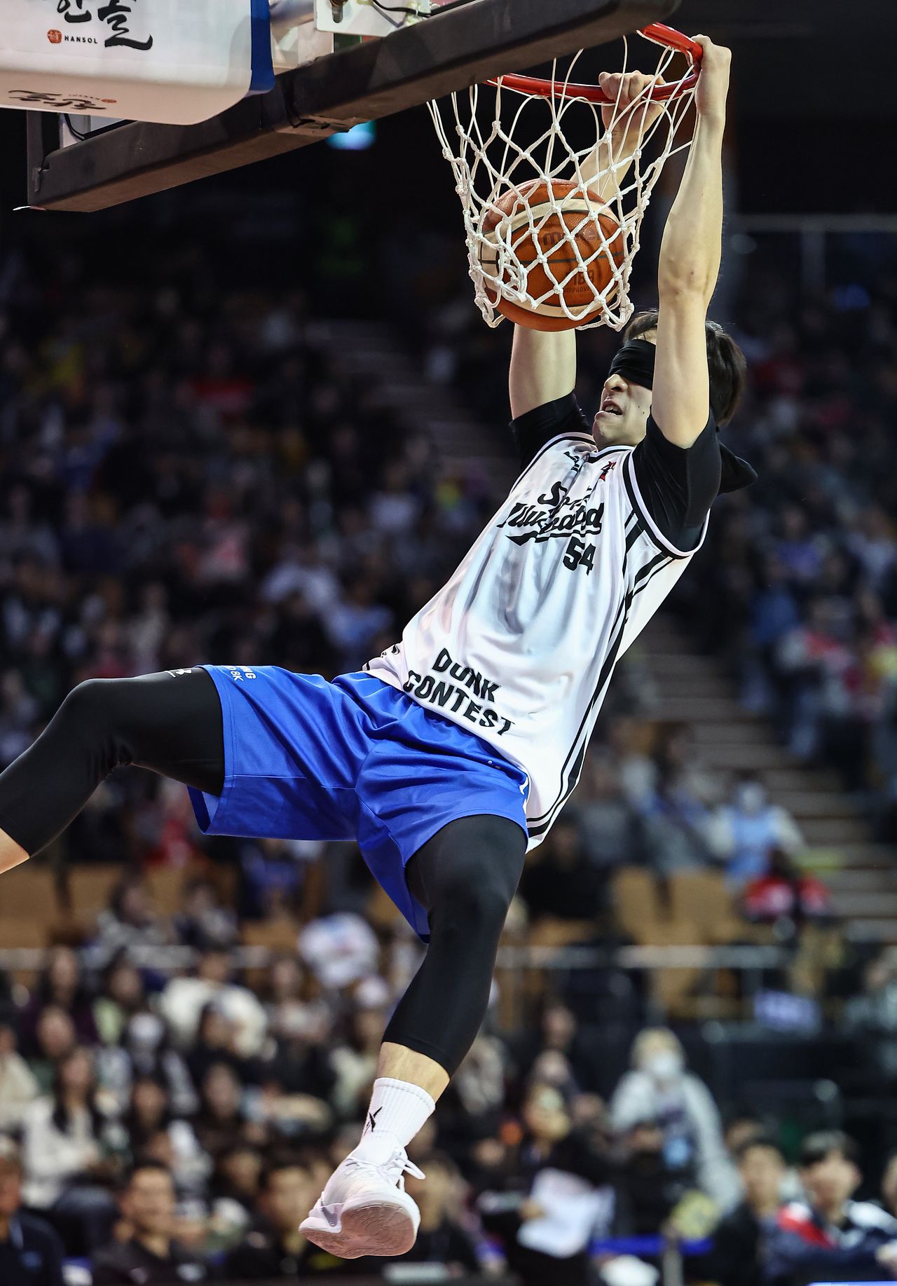 프로농구 올스타전이 18일 서울 잠실실내체육관에서 열렸다. 올스타전 이벤트 덩크슛 콘테스트에서 눈을 가린 채 덩크슛에 성공하는 삼성 조준희. [뉴스1]