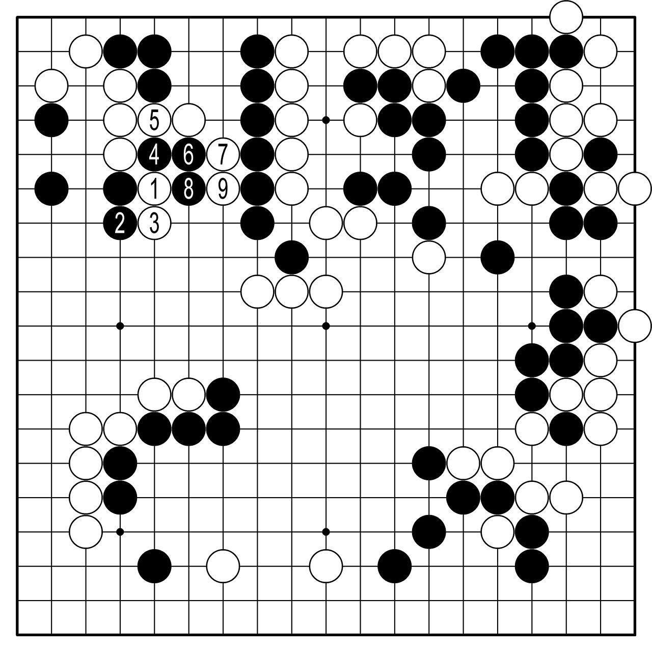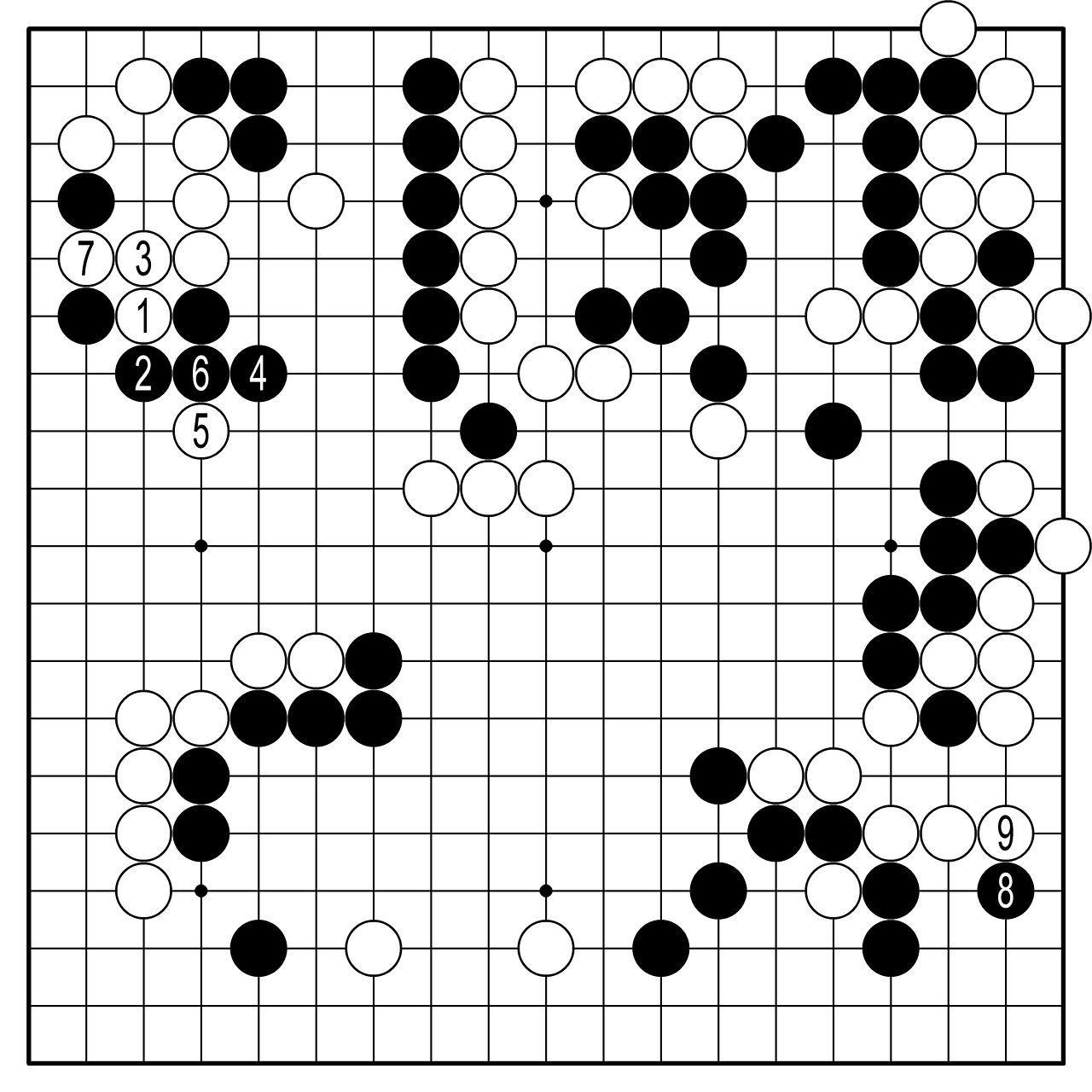 또 하나의 문제가 발생했다. 형세에 불안을 느낀 스웨 9단이 돌연 흑5의 강수를 들고나온 것이다. 흑1, 3은 이해가 간다. 여기서 5에 둔 것은 위험을 무릅쓰고 귀의 백을 못 살게 하는 강수다.