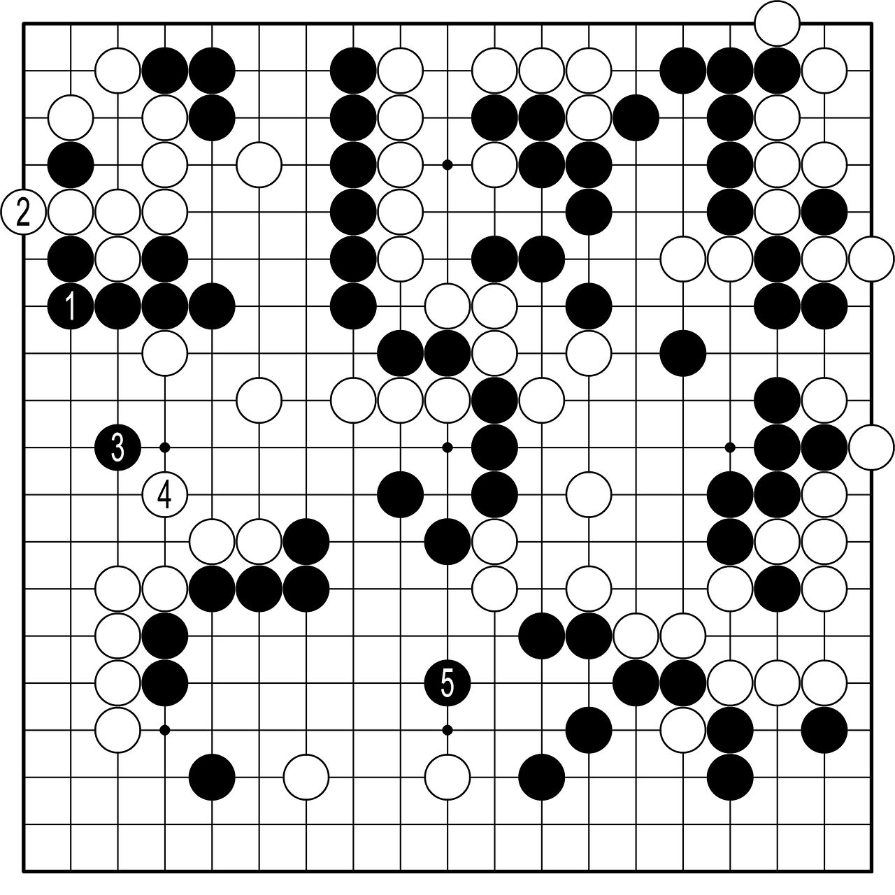◆AI의 타협=AI는 흑에게 공격도 수비도 아닌 중간을 권한다. 흑1, 3으로 선수 활용할 뿐 잡을 생각이 없다. 여기서 5로 천천히 공격하면 우세를 유지할 수 있다고 한다.