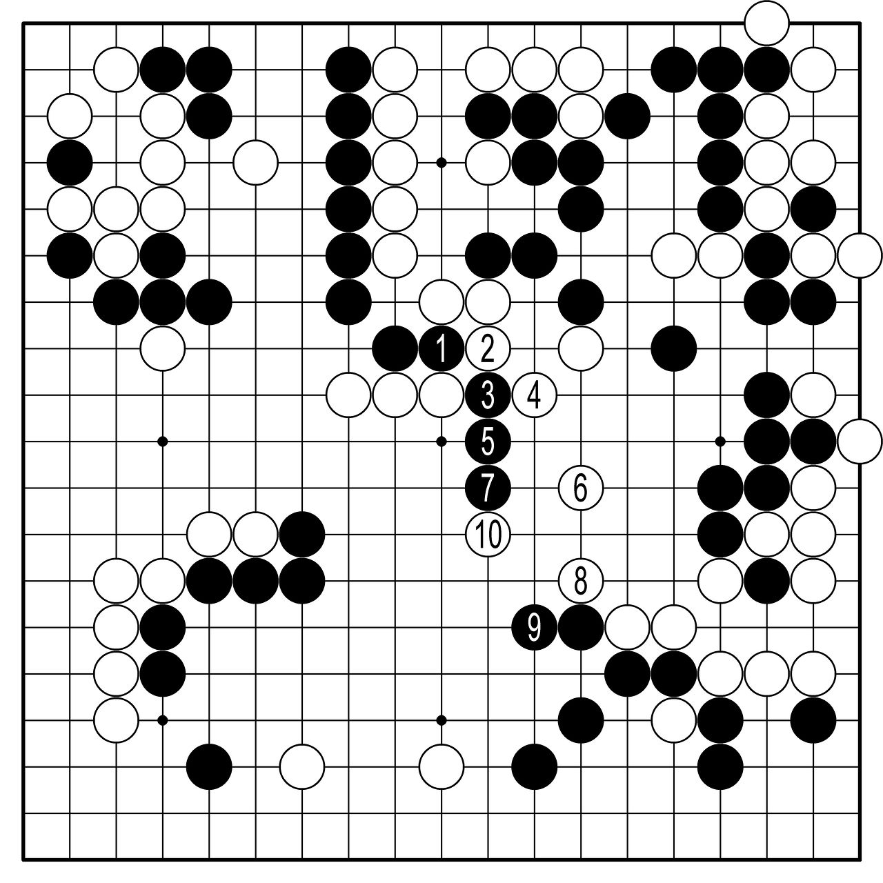장면⑧=흑은 좌상에서 위기를 넘기며 3집반의 우세를 확보했다. 스웨 9단은 내친걸음에 흑1, 3으로 절단해 승리를 굳히고자 한다. ‘절단’을 좋아하는 사람은 전투형이다. 돌은 끊어지면 약해지고 약해지면 이득이 발생한다. 전투형은 그 재미를 아는 사람이다. 흑1, 3의 절단도 비슷한 맥락에서 이해할 수 있다. 두 집이 없는 백이 4, 6으로 진출하는 건 당연한데 여기서 흑7이 눈길을 끈다. 철기둥을 연상시키는 강한 수법이지만 AI는 그냥 한 칸 뛰라고 한다. 흑7은 백8, 10이 제격이어서 차이가 좁혀졌다.