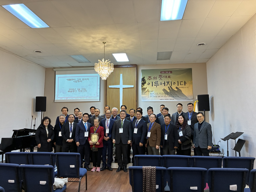 애틀랜타 한인교회협의회(회장 손정훈)는 22일 노크로스 복음동산 장로교회에서 소속 목사 24명이 참석한 가운데 올해 첫 정기총회를 열었다. 이 자리에서 인준된 올해 예산 규모는 7만5000달러로, 주로 복음화대회 및 유소년·목회자 체육대회 개최에 쓰일 예정이다. 2005년부터 지난 20년간 협회 재무 담당으로 봉사하던 이순희(앞줄 왼쪽 다섯 번째) 애틀랜타 한인회 패밀리센터 소장이 이날로 은퇴하며 감사패를 수여받았다. 총회 참석 목사들과 관계자들이 한 자리에 섰다.