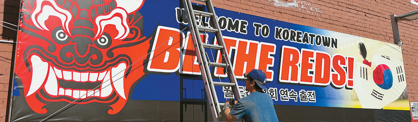 2026년 북중미 월드컵을 앞두고 LA 한인타운 웨스턴 애비뉴와 올림픽 불러바드 교차로 모빌 주유소 인근 한인회관 건물 벽에 대한민국 축구대표팀 응원 배너가 설치되고 있다. 김상진 기자