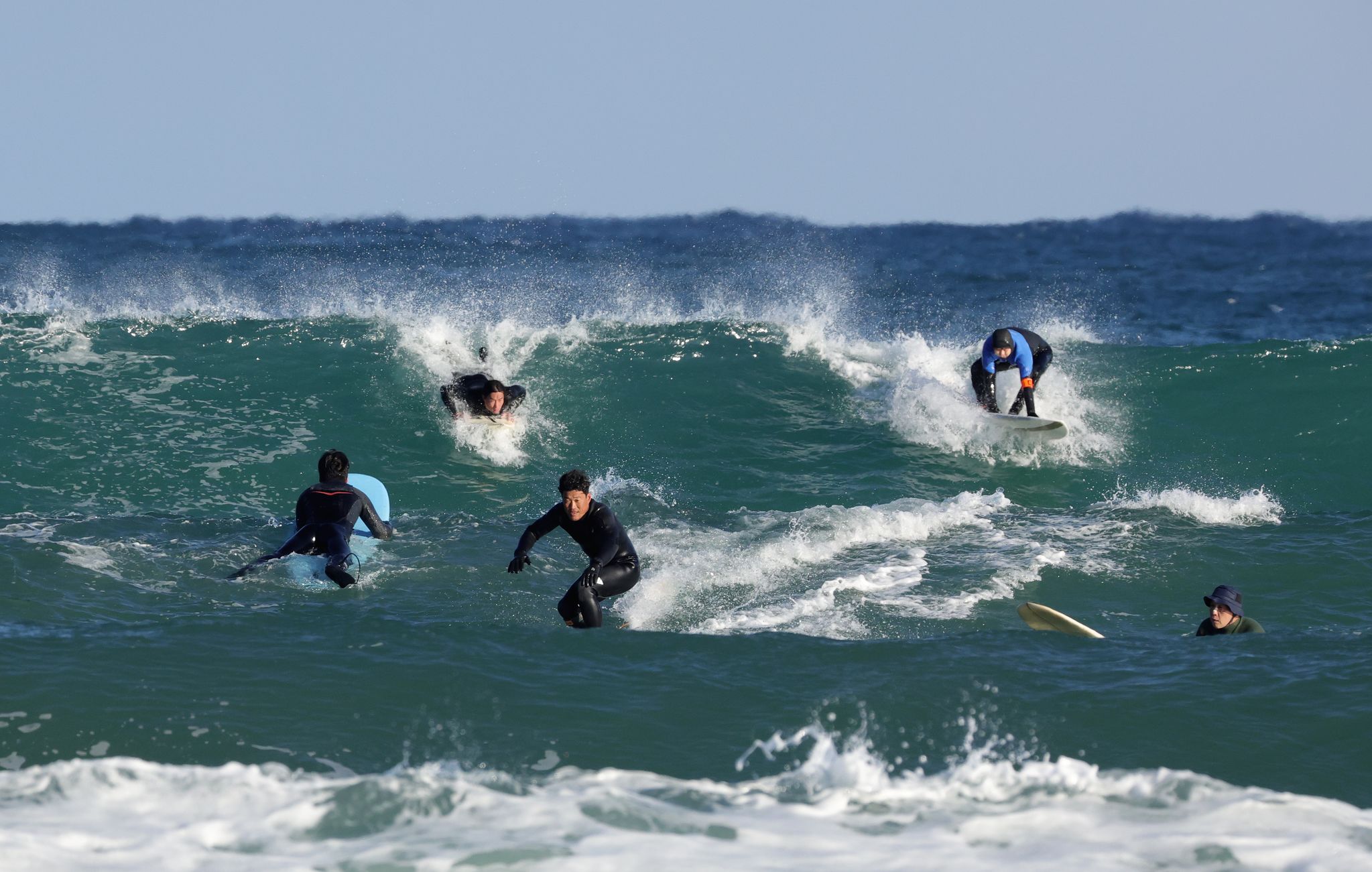 강원 양양군 강현면 물치해변. 아침이라 기온은 영하 6도. 날카로운 바람까지 불어 잠깐 서 있는데 몸이 꽁꽁 얼었다. 하지만 바닷속은 달랐다. 수온은 기온보다 10도 이상 높다. 겨울 서퍼들의 “물속은 따뜻하다”는 말이 그제야 이해됐다. 저 멀리 푸른 바다에서 하얀 파도가 쉴 새 없이 밀려왔다. 서퍼들이 앞다투어 파도에 뛰어들어 파도와 호흡을 맞추고 있었다. 어림잡아 50명은 훌쩍 넘어 보였다.