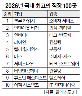 구인 구직 및 직장 평가 사이트 글래스도어는 최근 ‘2026년 국내 최고의 직장 100곳’을 발표하고 크루 카워시를 1위로 선정했다. (표 참조)