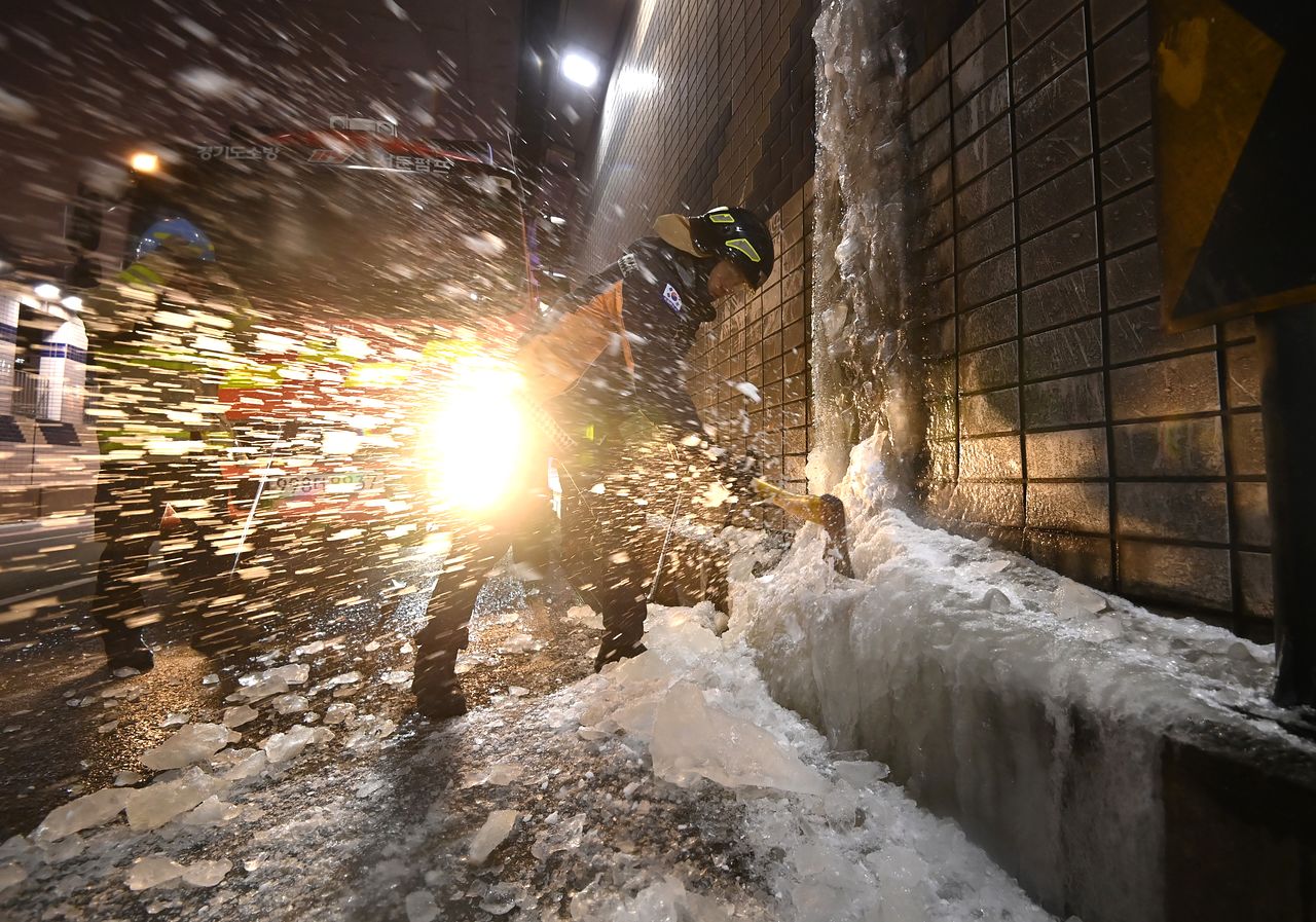 27일 경기도 수원시 팔달구 화서지하차도에서 소방대원이 고드름을 제거하고 있다. 기상청은 28일도 북쪽에서 내려오는 찬 공기의 영향으로 전국적으로 아침 최저기온이 -16~-3도까지 떨어지는 등 강추위가 이어지겠다고 예보했다. [뉴시스]