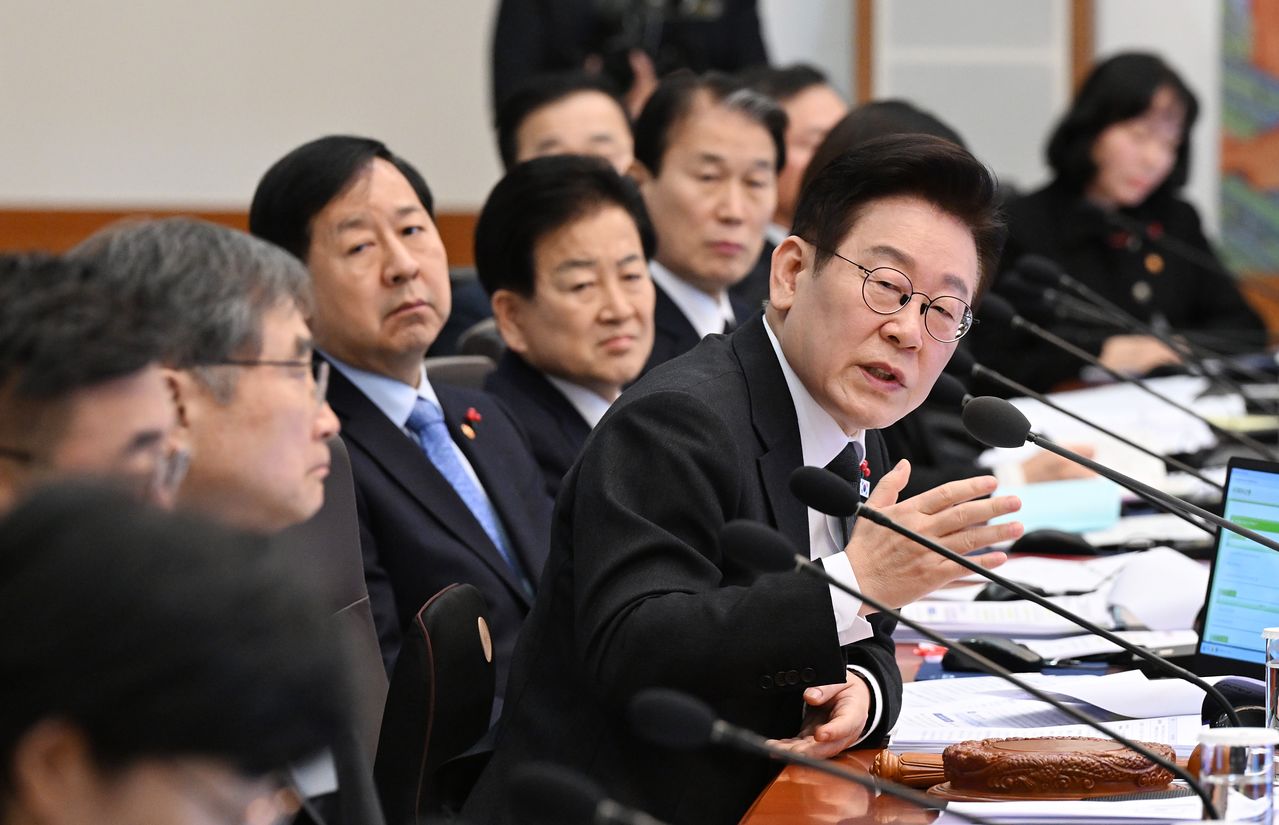 이재명 대통령이 27일 청와대에서 열린 국무회의에서 발언하고 있다. 이 대통령은 “경제 구조의 대전환을 통한 모두의 성장을 제대로 실현하기 위해서는 부동산에 비정상적으로 집중된 우리 사회의 자원 배분 왜곡을 반드시 바로잡아야 한다”고 말했다. 이 대통령은 지난 25일에도 X에 이례적으로 네 차례나 글을 올려 오는 5월 9일 다주택자에 대한 양도세 중과가 시행될 방침임을 분명히 한 바 있다. [청와대사진기자단]