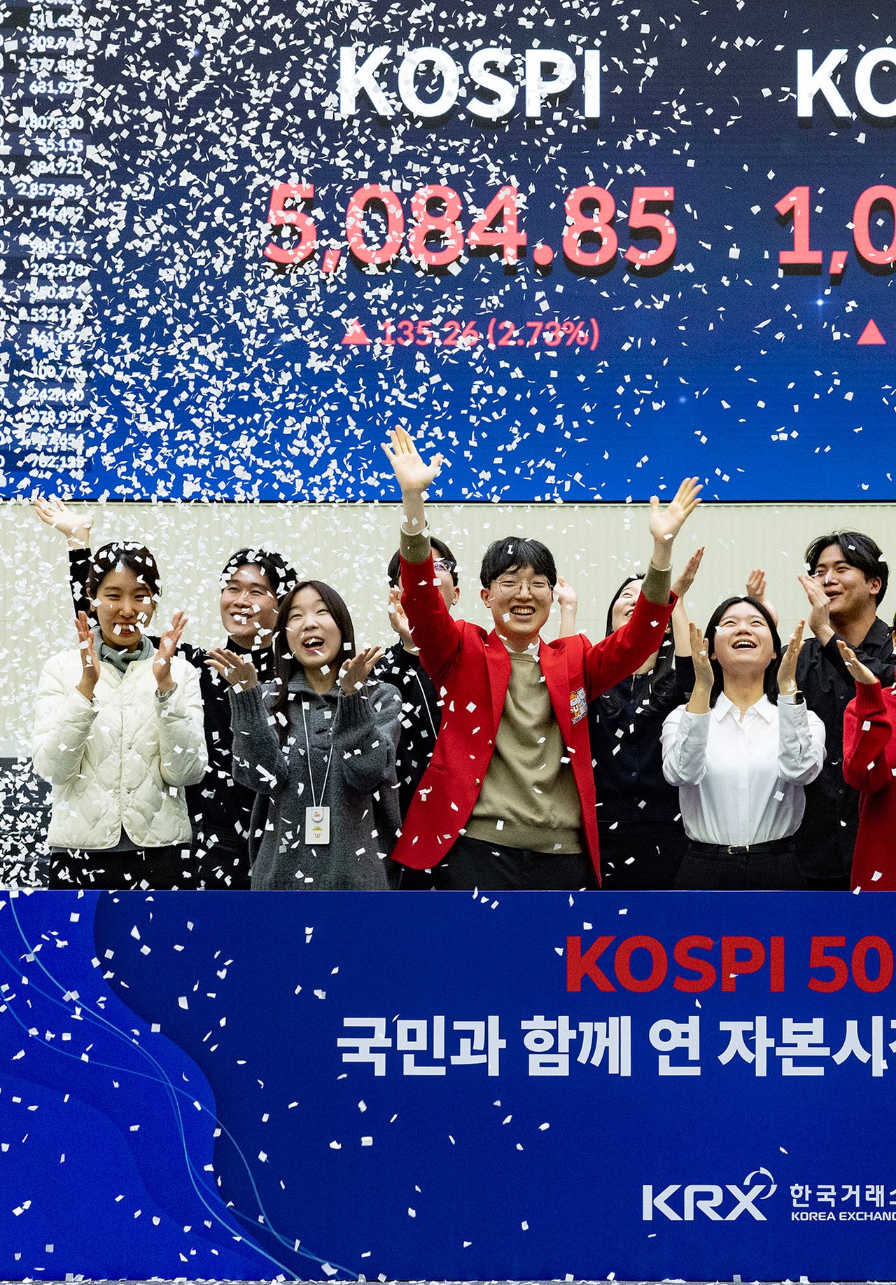 코스피가 사상 처음 종가 기준 5000선을 돌파했다. 27일 코스피는 전날보다 2.73% 오른 5084.85에 장을 마쳤다. 이날 서울 한국거래소에서 직원들이 종가가 표시된 전광판 앞에서 세리머니를 하고 있다.