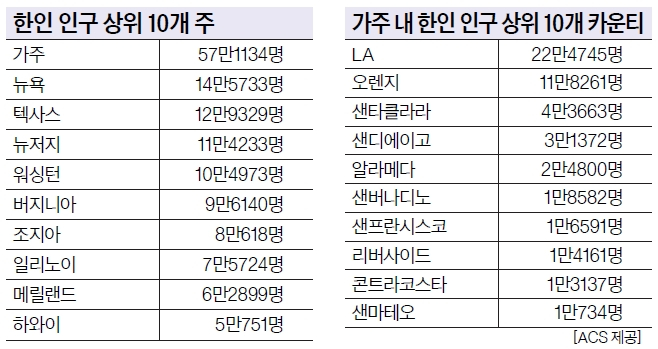 한인 최다 거주 지역을 주별로 보면 가주가 57만1134명으로 가장 많았다. 이어 뉴욕(14만5733명), 텍사스(12만9329명), 뉴저지(11만4233명), 워싱턴(10만4973명), 버지니아(9만6140명), 조지아(8만618명), 일리노이(7만5724명), 메릴랜드(6만2899명), 하와이(5만751명), 플로리다(4만6872명) 순으로 집계됐다.