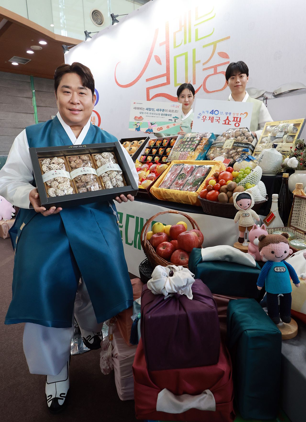 우체국쇼핑 홍보 모델인 개그맨 문세윤과 모델들이 29일 서울 중구 서울중앙우체국에서 열린 ‘2026년 우체국쇼핑 설 선물대전’에서 할인 행사를 선보고 있다. 우체국쇼핑은 다가오는 설날을 맞이해 우수 특산물을 최대 40% 이상 할인 판매한다. [뉴스1]