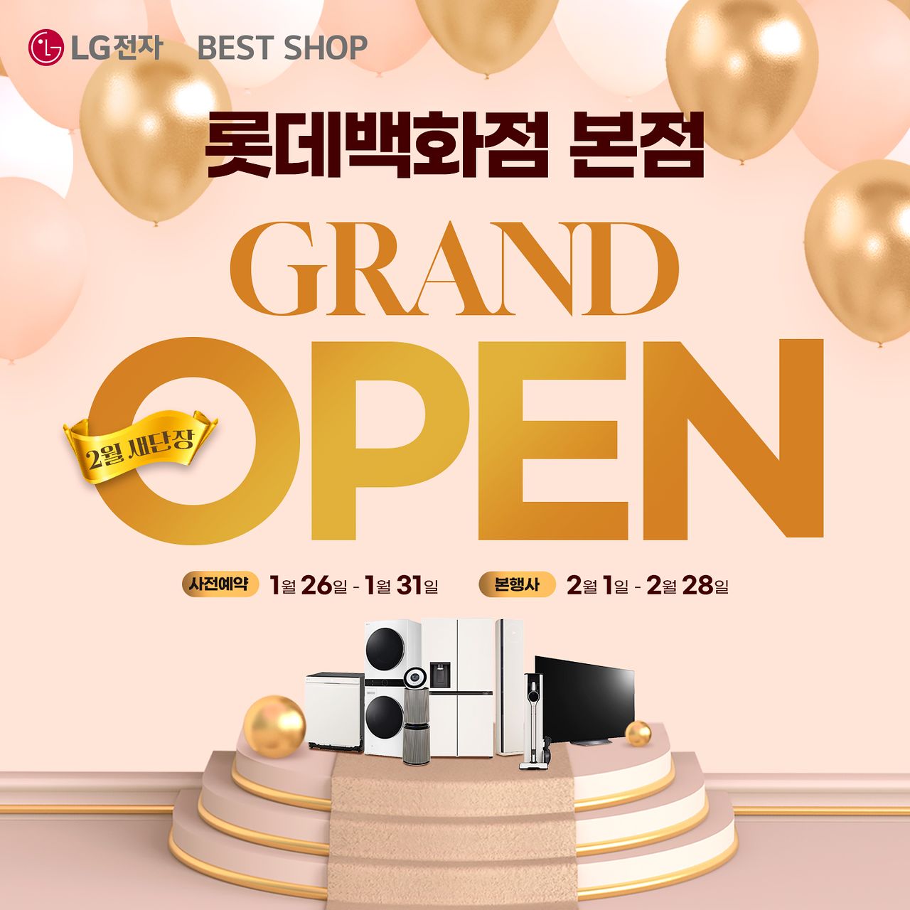 프리미엄 가전매장 LG전자 베스트샵 롯데백화점 본점이 2월 새단장을 마치고 대규모 그랜드 오픈 가전 세일 행사를 개최한다. 이번 행사는 1월 26일부터 31일까지 진행되는 사전 예약을 시작으로, 2월 1일부터 28일까지 한 달간 본행사가 이어진다.