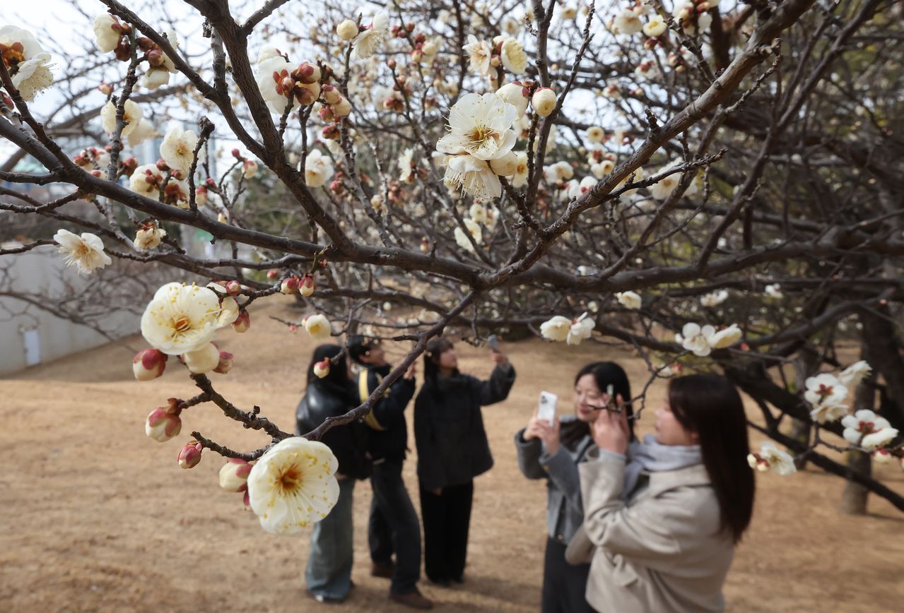 2일 부산 남구 동명대학교 본관 앞 정원에서 학생과 교직원들이 활짝 핀 매화를 바라보며 사진을 찍는 등 캠퍼스의 봄기운을 만끽하고 있다.