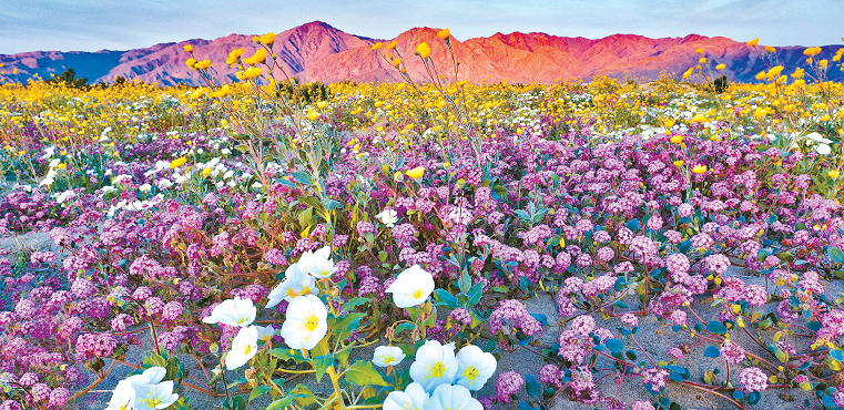 캘리포니아 안자 보레고 사막 주립공원 헨더슨 캐년 로드 일대에 예년보다 이른 시기의 야생화가 피었다. 지난해 11~12월 기록적인 강우 영향으로 남가주 일부 지역에서는 봄꽃 만개 시기가 예년보다 앞당겨질 수 있다는 전망도 있다. [Secret Los Angeles 제공]