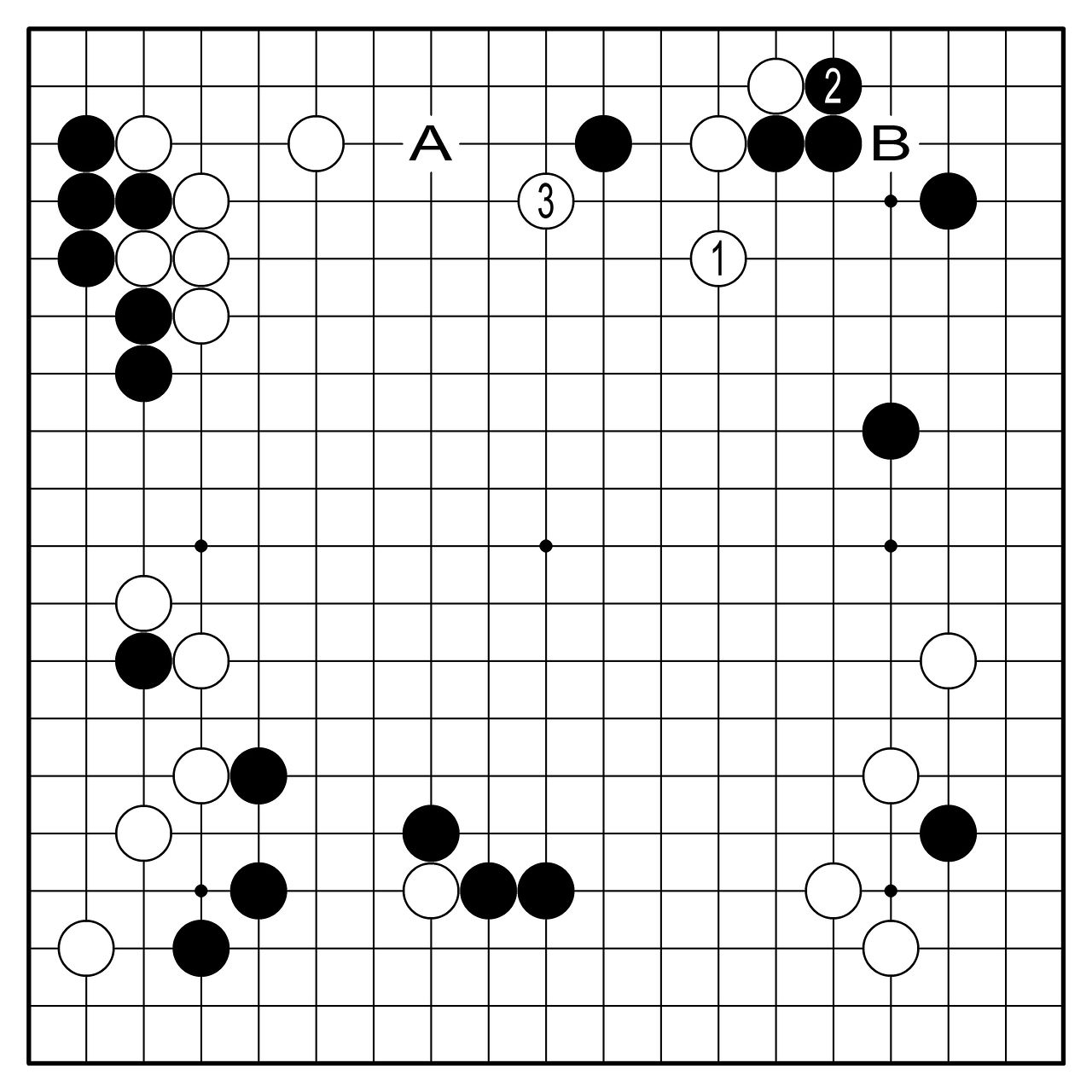 ◆AI의 행마=잠깐 짚고 넘어가자. AI는 가벼운 행마를 좋아하고 무거운 행마를 싫어한다. 〈장면③〉의 백5는 무겁다. AI는 그 대신 이 그림의 백1처럼 가볍게 뛰라고 한다. 흑2로 받으면 3으로 씌우고 흑2 대신 A로 전개하면 B의 맥을 짚는다. 너무 심오한 얘기라 소화는 잘 안 된다.