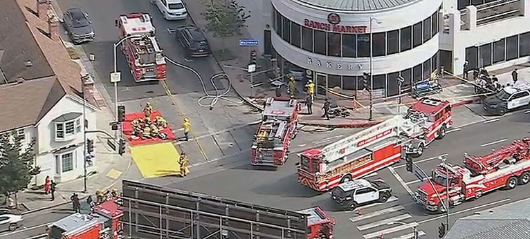 LA 웨스트우드 지역 99랜치마켓에서 5일 오후 12시 11분쯤 은색 세단이 자전거를 탄 사람을 친 뒤 마켓 유리창을 뚫고 베이커리까지 돌진했다. 이 사고로 3명이 현장에서 숨지고 6명이 다쳤다. 구조 작업으로 웨스트우드 블러바드 일부 구간이 통제됐다. [KTLA 캡처]