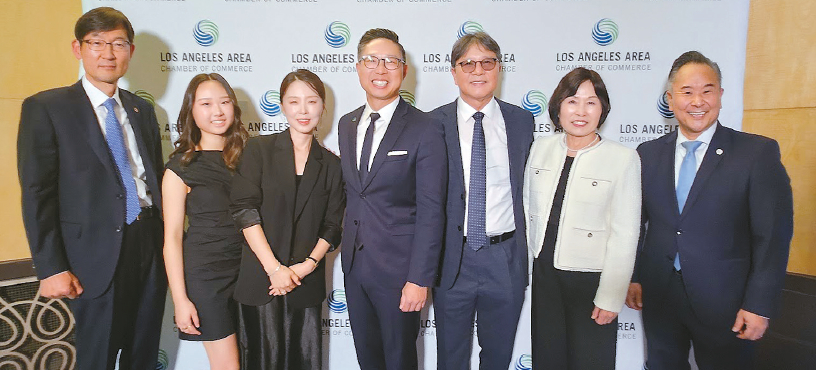 LA상공회의소 이사장 취임 LA상공회의소 첫 한인 이사장에 오른 앤디 박(가운데) 언스트&영 매니징 파트너가 지난 5일 오후 할리우드 소재 로즈 호텔 볼룸에서 열린 취임식에서 1000여 명의 LA 상공인들의 축하를 받으며 취임했다. 박 이사장과 가족들, 존 이 LA 12지구 시의원(맨 오른쪽), 이진호 대한항공 미주지역 본부장(맨 왼쪽)이 함께 기념 촬영을 하고 있다.