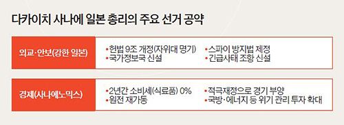여권의 약점인 민생에서도 ‘책임 있는 적극 재정’을 내걸어 야권과의 쟁점을 사실상 지웠다. 이원덕 국민대 교수는 “다카이치 총리가 야권이 주장하던 ‘소비세(식료품) 제로’를 공약으로 내세우자 정책 쟁점이 사라지고 다카이치가 선거의 메인 이슈가 됐다”고 분석했다.