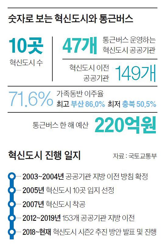 전국 혁신도시는 10곳. 지역 균형 발전과 혁신 거점 활성화를 내걸고 ‘시즌1’이 2003년부터 추진돼 16년 만인 2019년 149개 공공기관이 옮기며 마무리됐다. 그중 47곳이 한 해 220억여원을 대며 통근버스를 운영 중이다. 금요일 오후만 되면 텅 비는 도시에 현지 소상공인들은 울상이다.
