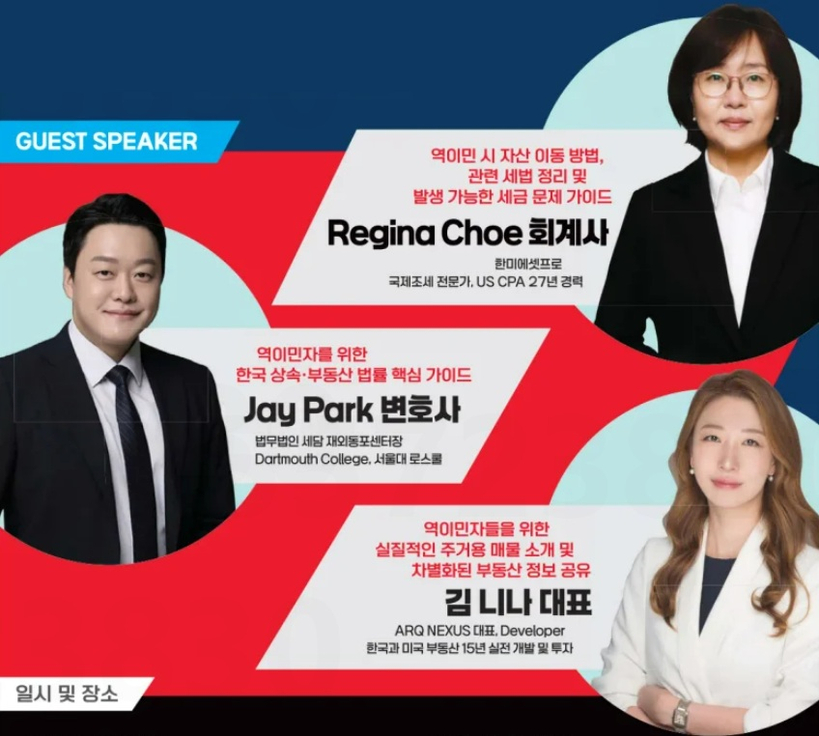 미국 내 자산을 한국으로 이전하거나 정리하려는 역이민 수요가 늘면서 관련 정보를 제공하는 세미나가 열린다. '파라다이스 리얼티'와 'LNS 인베스트먼트'가 공동 주최하는 이번 행사에서는 미국에서 형성한 자산의 보호.이전.정리 방안을 다룬다. 국제조세 전문가 레지나 최 회계사, 이민법 전문 제이 박 변호사, 부동산 개발 전문가 김 니나 대표가 초청 연사로 나선다. 세무.법률.부동산 분야 핵심 이슈를 짚으며 역이민 과정의 리스크를 설명할 예정이다. 행사는 2월 19일 부에나파크, 2월 21일 LA에서 열린다. 참가비는 10달러이며 사전 예약이 필요하다.