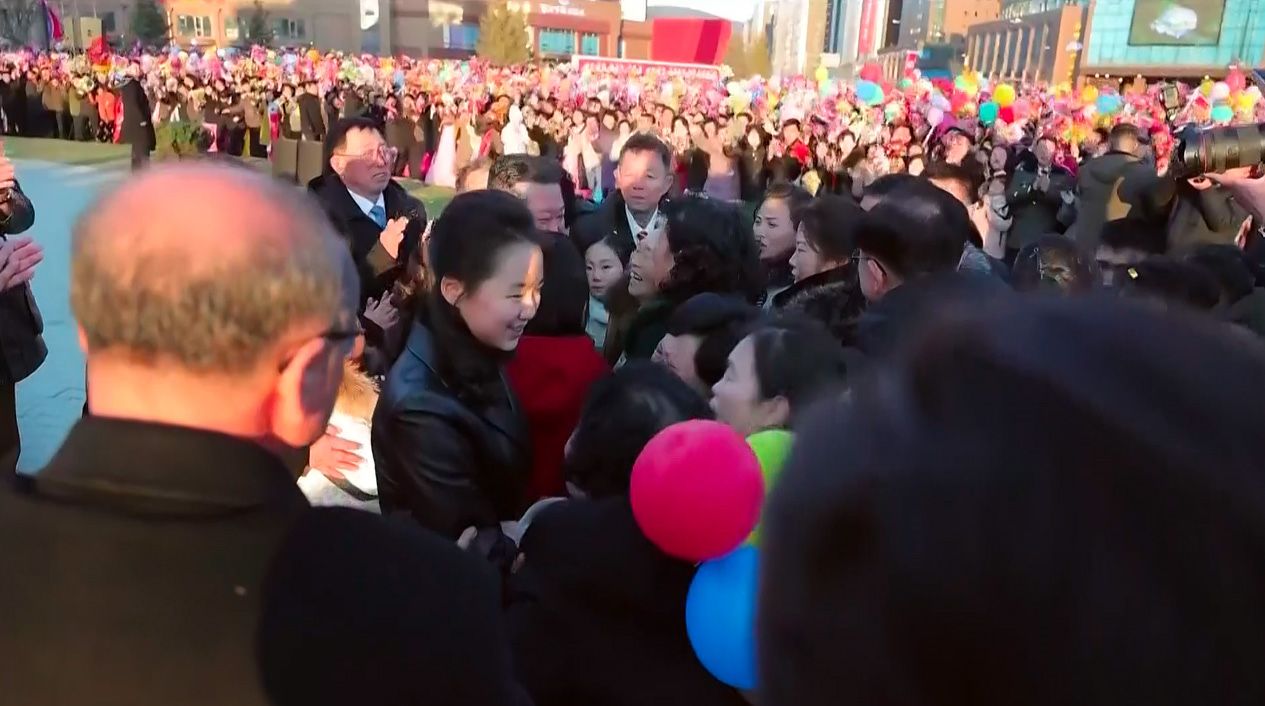 김정은 북한 국무위원장이 지난 16일 딸 주애와 함께 평양 화성지구 4단계 1만 세대 살림집 준공식에 참석했다고 북한 조선중앙TV가 17일 보도했다. 사진은 이날 김 위원장과 주애가 새 주택 입주자들과 어울려 축하하는 모습. [조선중앙TV 캡처=뉴시스]