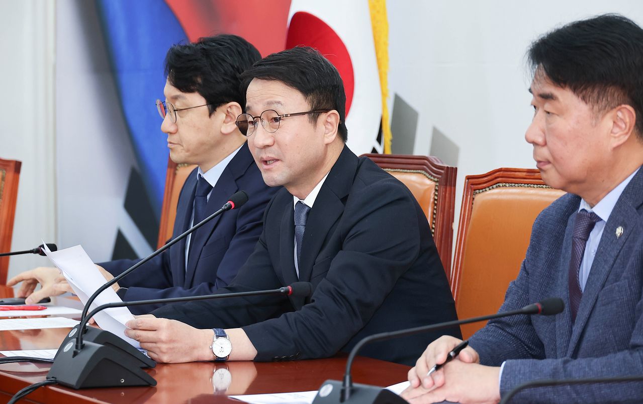 한병도 더불어민주당 원내대표(가운데)가 18일 국회에서 열린 기자간담회에서 발언하고 있다. 한 원내대표는 이날 “오는 24일 본회의 추진을 국회의장에게 요청하고, 또 3~4월 매주 목요일 본회의를 열어 국정 과제와 개혁 법안을 처리하겠다”고 밝혔다.