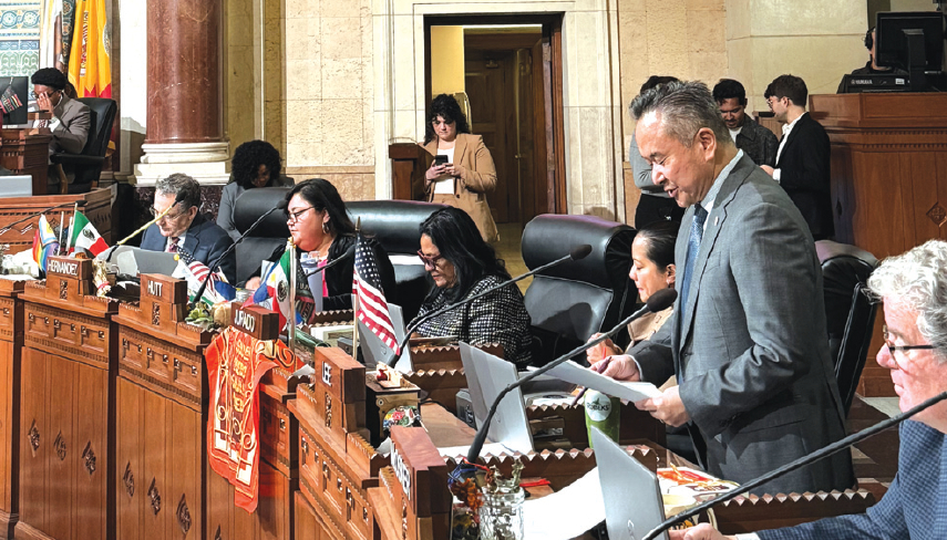 LA시의회 내 유일한 한인 시의원인 존 이(12지구) 시의원이 지난 17일 열린 LA시의회 본회의에서 음력 설날 선포식을 진행했다. 이 시의원은 올해가 '적토마의 해'라며 "전 세계 수백만 명이 전통적으로 가족과 함께 시간을 보내며 새로운 해가 시작되기에 앞서 복을 빈다"고 음력 설날이 갖는 의미를 설명했다. 이날 그는 정을 나누는 설날 문화에 맞춰 동료 시의원들에게 모찌 도넛을 선물하기도 했다. [존 이 시의원실 제공]