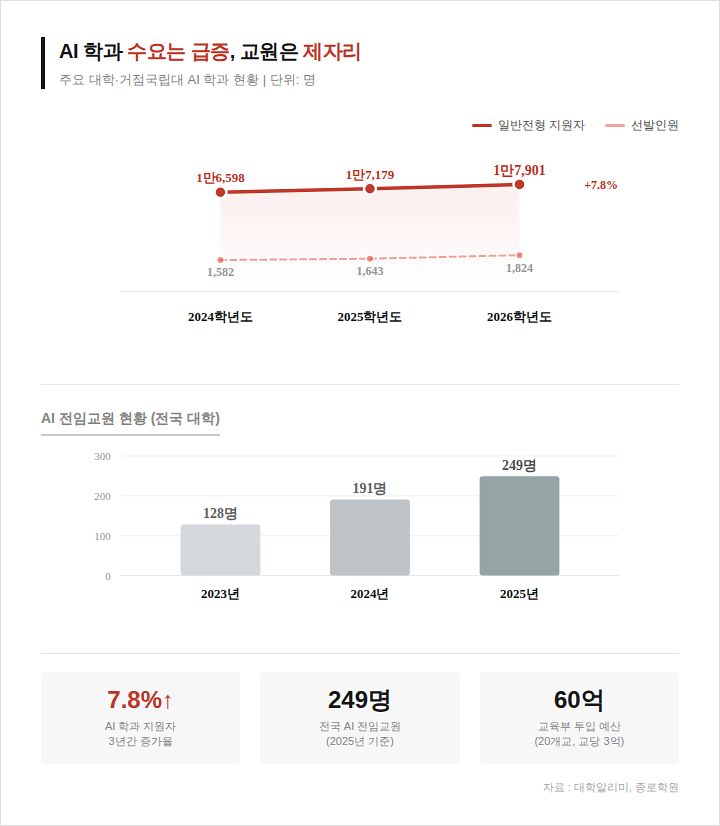 대학알리미에 다르면 전국 대학의 AI 관련 전임교원은 249명(2025년)에 불과하다. 2023년(128명)에 비해 두 배가량 늘었으나, 전국적인 AI 교육 수요를 감당하기에는 부족한 수준이다. 서울의 한 사립대 교무처장은 “주요 대학의 AI 학과가 컴퓨터공학이나 사이버보안 전공 교수를 겸임 형태로 채용하고 있다”며 “현직에서 일하는 분들을 겸임 교수 형태로 모셔오는 것도 보수, 수업 운영 측면에서 결코 쉬운 일이 아니다”라고 말했다.