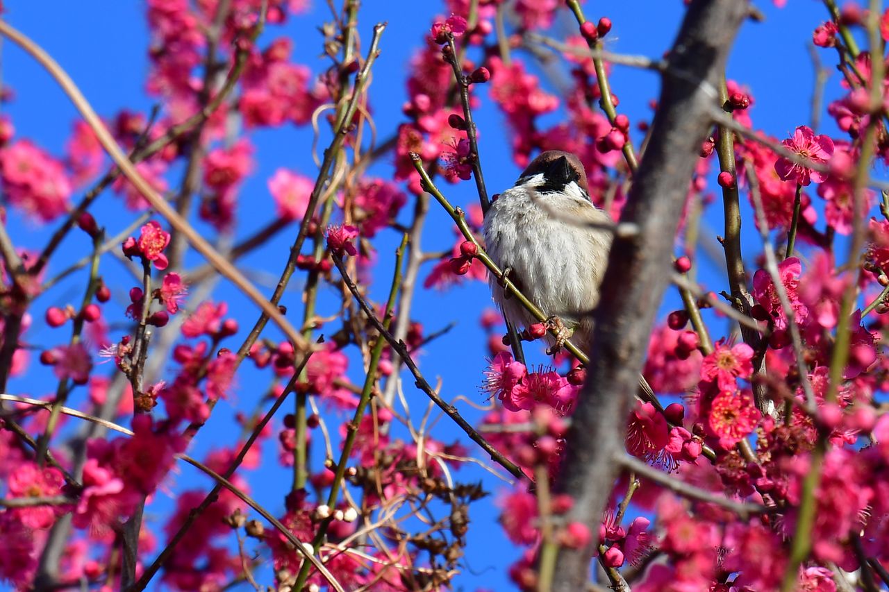 23일 경북 포항시 남구 연일읍 도로변에서 참새 한 마리가 활짝 핀 홍매화 나무에 앉아 있다. 오늘(24일)은 전국 대부분 지역이 포근한 가운데 비 또는 눈이 내릴 것으로 기상청은 예보했다. [뉴스1]