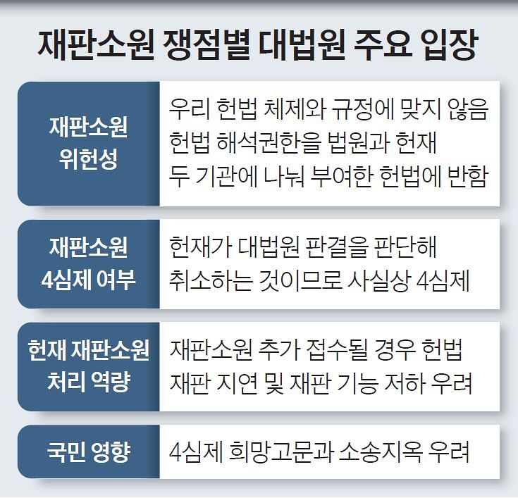 이는 재판소원의 모델로 거론되는 독일에서는 연방헌법재판소가 헌법상 연방법원의 우위에 있어 한국의 헌재, 대법원과는 헌법상 관계가 다르다는 점을 지적한 것이다. 독일에는 일반·행정·노동·사회·재정 분야별로 5개의 대법원(연방최고법원)이 있고, 그 아래에 지방법원(1심)과 고등법원(2심)이 있다. 확정판결 이후에도 자신의 기본권이 침해되었다고 느끼는 경우 연방헌법재판소에 재판소원을 제기할 수 있다.