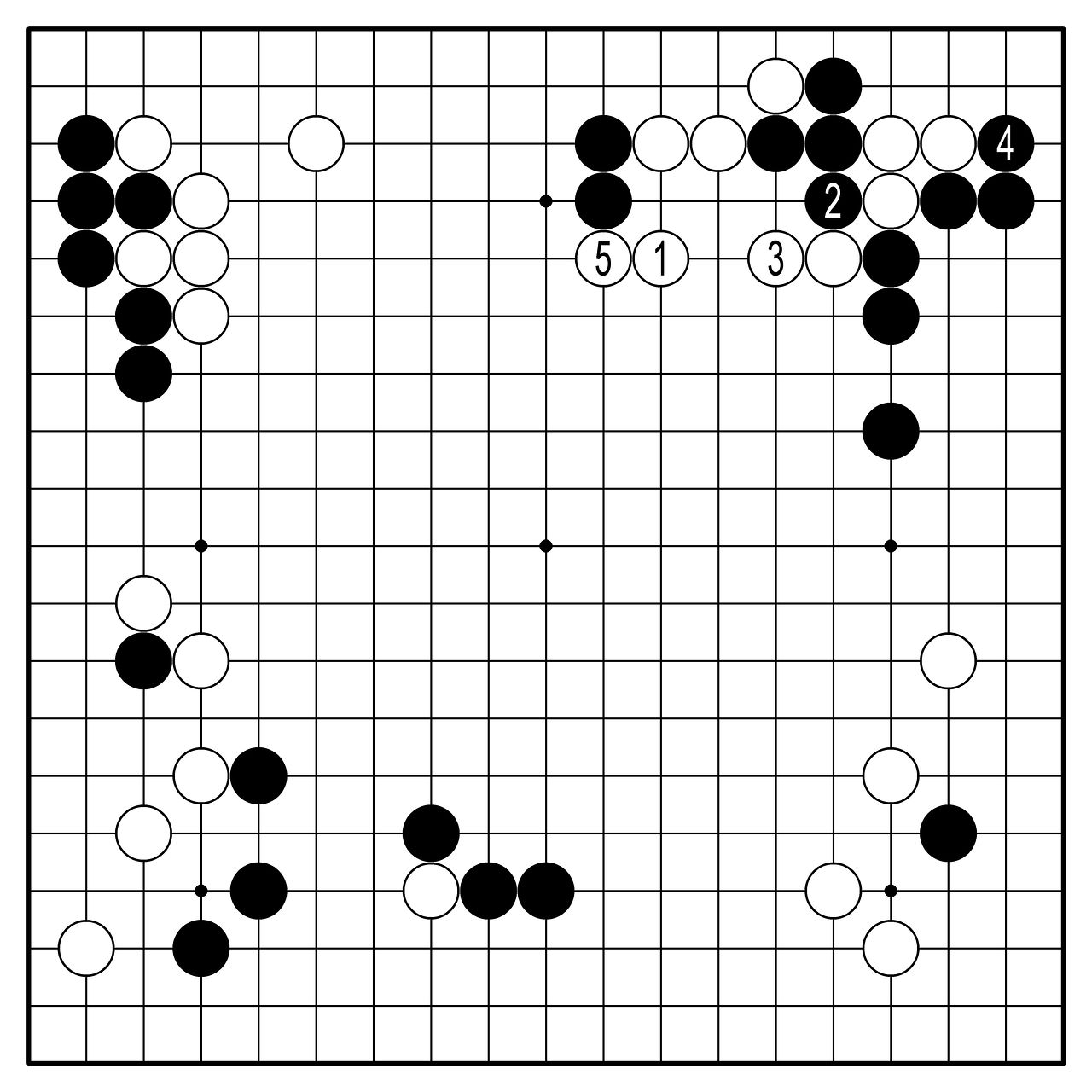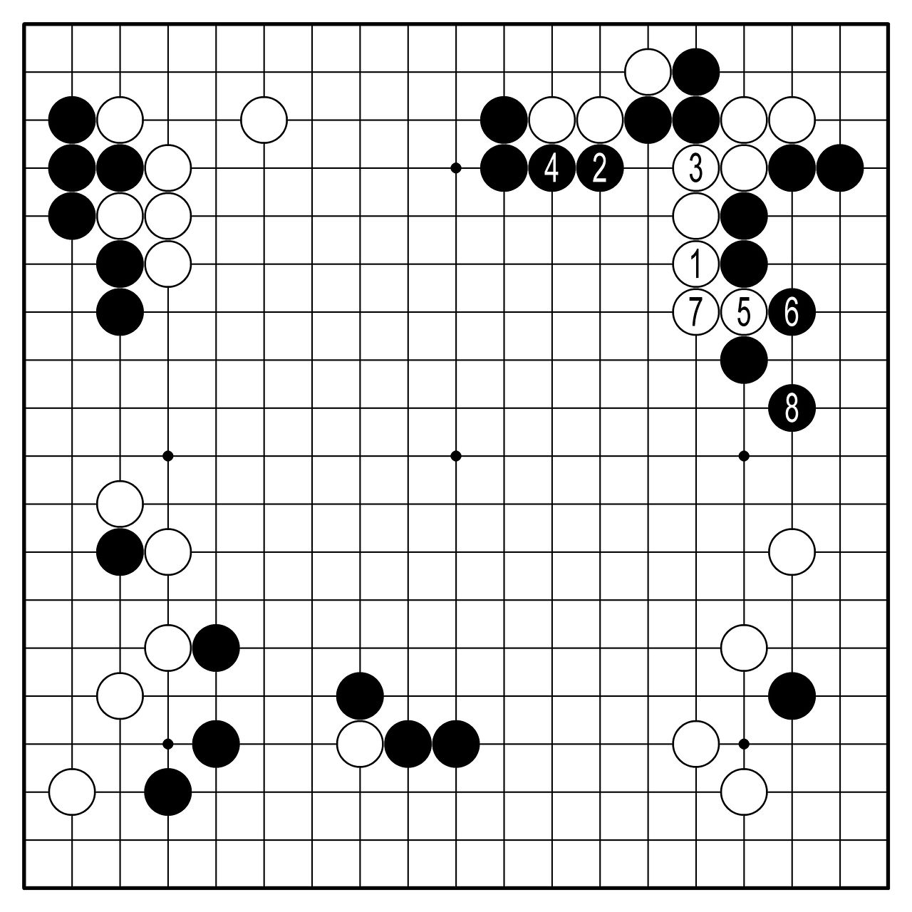 ◆AI의 판단=AI는 백1로 뛰어나오는 한 수라고 말한다. 이쪽을 살리면 귀는 잡힌다. 실리의 크기는 귀 쪽이 조금 더 클 것이다. 그러나 상변을 살리면 5로 공격할 수 있는 보상이 있다. 이 그림은 백 2집반 우세다. 승률은 70%.