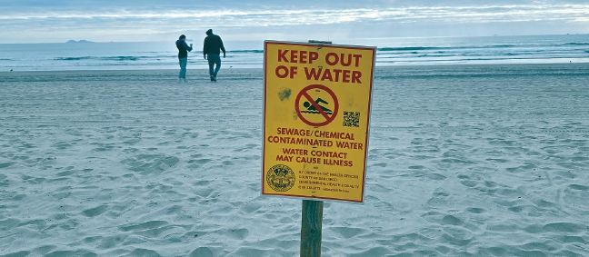 샌디에이고 카운티 전역에 내린 비로 멕시코 쪽에서 티후아나 강을 타고 흘러 들어온 생활폐수가 카운티 남부해안가에 유출됨에 따라 일부 비치에 대한 입수금지 조치가 지난 21일부터 시행되고 있다. 카운티 정부에 따르면 임페리얼 비치에서 실버 스트랜드를 거쳐 코로나도까지 해변에 대한 입수금지 조치가 내려졌다. 사진은 코로나도 비치에 설치된 입수금지 표지판.