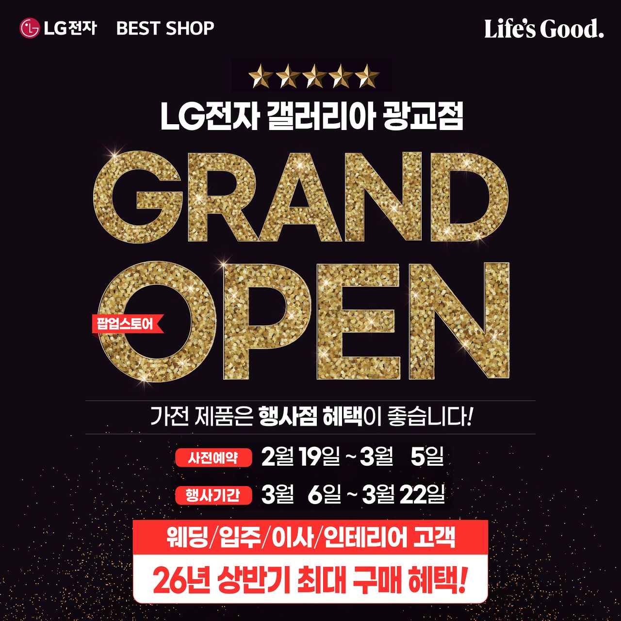 프리미엄 가전매장 LG전자 베스트샵 갤러리아 광교점은 팝업스토어 그랜드 오픈 기념 대규모 가전행사를 실시한다. 행사는 3월 5일까지 사전예약을 시작으로 3월 6일부터 22일까지 이어진다.