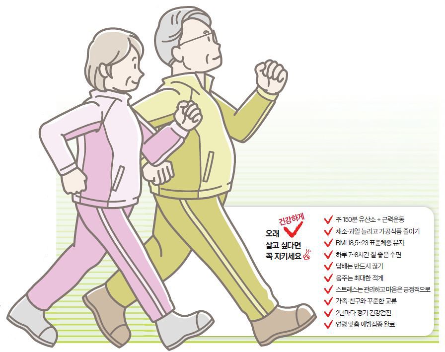 ① 꾸준한 운동 일주일에 최소 150분의 중등도의 유산소 운동(빠르게 걷기, 등산 등) 또는 75분의 고강도 운동(조깅, 자전거 타기, 수영 등)과 주 2회 이상의 근력 운동이 필수적이다. 개인의 취향에 따라서 두 강도의 운동을 적절하게 조합하거나 주말에 한꺼번에 몰아서 하는 운동도 같은 효과가 있다. 중강도 신체 활동은 하루 빠른 걸음의 7000~8000보에 해당한다. 이렇게 운동을 하면 심폐 기능과 근력을 강화하고 혈관 건강을 개선하며 건강한 체중을 유지할 수 있다. 수명 연장에 기여할 뿐만 아니라 고혈압·당뇨병·이상지질혈증·심장질환·뇌질환·암 등의 발생 위험을 낮추는 효과가 있다. 또한 정서적 안정과 수면의 질을 높이고 근감소증 예방에도 도움이 된다.