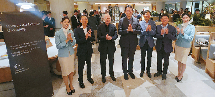 대한항공이 지난달 27일 LA국제공항 신규 비즈니스·일등석 라운지를 공개했다. 톰브래들리 국제선 청사 내에 자리한 대한항공 신규 라운지는 한식 메뉴와 키친시설을 강조했으며 오는 6일부터 일반에 공개된다. 미디어 오픈 행사에는 조원태(가운데) 한진그룹 회장을 비롯해 항공, 관광업계, 언론사 관계자 200여명이 참석했다. 왼쪽 두 번째부터 대한항공 황오렬 LA공항지점장, 데이비드 페이시 기내식·라운지 부문 부사장, 조 회장, 이진호 미주지역 본부장, 아시아나항공 강기택 미주지역 본부장이 자축하고 있다.