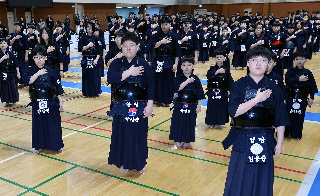 대전시체육회 검도팀 창단식과 대전시장기 검도대회가 2일 대전시 한밭체육관에서 열린 가운데 행사에 참가한 학생들이 국민의례를 하고 있다.