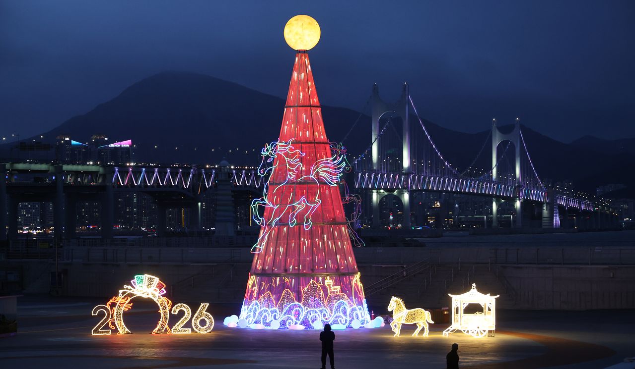 ‘2026 정월 대보름’을 앞두고 부산 남구가 용호별빛공원에 17m 높이, 지름 7.5m 친환경 LED 달집을 1일 밤 점등해 시민들의 눈길을 끌고 있다.