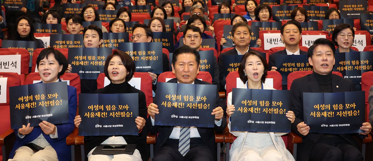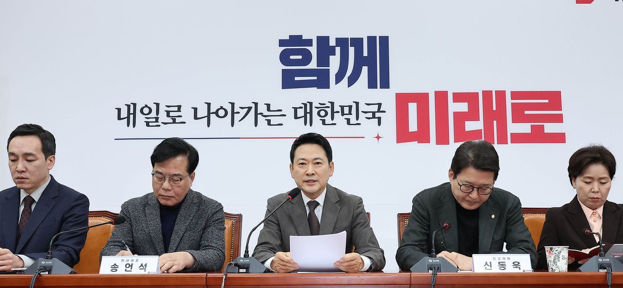 2일 국회에서 열린 ‘서울여성전진대회’에서 정청래 더불어민주당 대표(앞줄 가운데) 등이 구호를 외치고 있다(위 사진). 같은 날 장동혁 국민의힘 대표(가운데)가 최고위원회의에서 발언하고 있다. 국민의힘은 ‘사법 3법’에 대해 대통령의 거부권 행사를 촉구하며 오늘(3일) 청와대로 도보행진할 예정이다. [뉴시스]