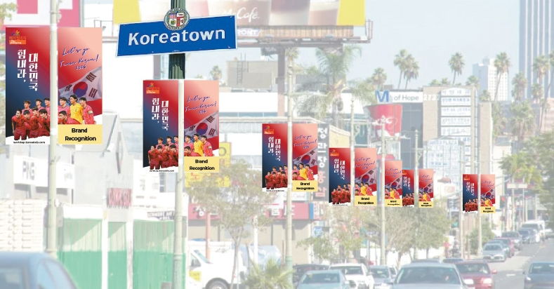 배너는 LA 한인타운 주요 도로 4개 구간의 가로등 120개에 설치됩니다. 5월부터 7월까지 약 두 달간 24시간 노출되며 태극기 바탕의 응원 메시지와 광고주 브랜드가 양면으로 인쇄됩니다.