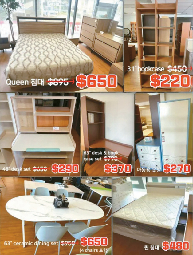 '보루네오 라미라다 BIF 직영 총판'이 퍼시스(Fursys), 아이룸(iloom) 등 사무용과 가정용 가구 전 품목을 대상으로 빅 클리어런스 세일을 실시한다. 퀸 침대부터 31인치 책장, 아동용 옷장, 63인치 세라믹 다이닝 세트 등 기존 매장 전시 제품을 특별가에 판매한다. 한국 생산 공장 직송 판매 방식으로 세일가 대비 최대 30% 추가 절감 혜택을 제공하며, 전문 디자이너의 무료 견적 서비스와 5년 무상 A/S 워런티도 지원한다. 매장은 산타페 스프링스에 위치하며, 월~금 오전 10시부터 오후 5시, 토요일 오전 11시부터 오후 5시까지 운영한다.