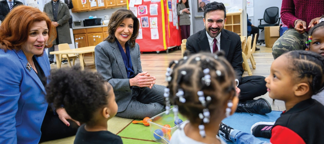 캐시 호컬 뉴욕주지사가 5일 뉴욕시의 유니버설 차일드케어 확대를 위해 12억 달러 이상을 투입하겠다고 발표하며, 향후 4년 안에 2세 대상 무상 보육 프로그램인 ‘2-Care’를 시 전역으로 확대할 것이라고 밝혔다. 호컬 주지사는 “육아는 개인 문제가 아닌 사회적 책임”이라고 전했다. 이날 맨해튼 여성·아동 지원 단체 Women in Need(WIN)의 차일드케어 센터를 방문해 아이들과 시간을 보내는 조란 맘다니 뉴욕시장과 호컬 주지사 모습.