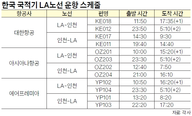 아시아나항공의 경우 LA 출발 OZ201편은 매일 오전 10시에 출발해 오후 3시 20분에 도착, 야간편 OZ203편은 오후 11시 30분 출발해 오전 5시 10분에 도착한다.