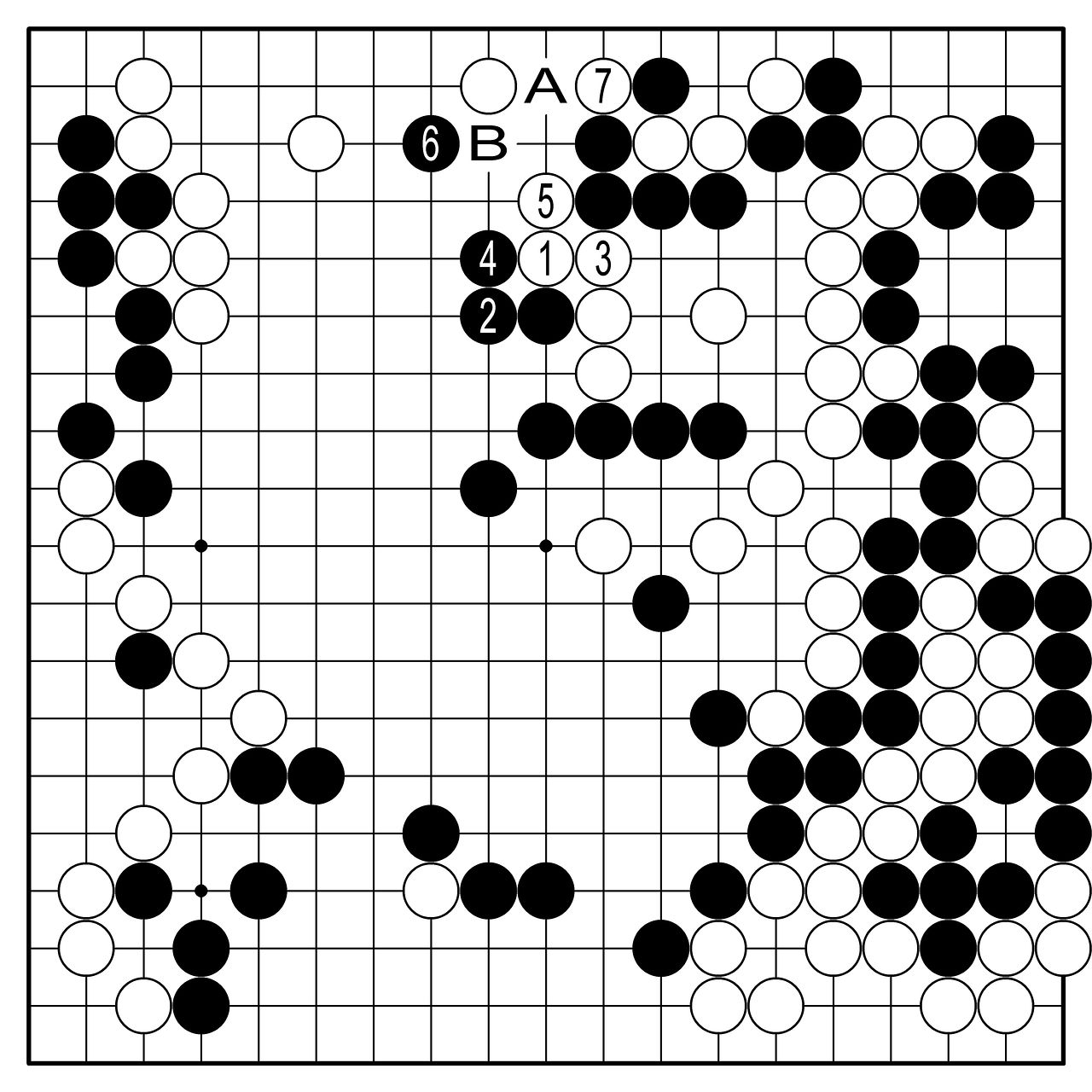 ◆삶의 묘수=AI는 위 그림의 백1, 3을 생략하고 이 그림처럼 그냥 빠져나가라고 한다. 백5에 흑6으로 잡으려 할 때 백7로 끊는 수가 귀신 같은 삶의 묘수. 흑에겐 A로 두는 한 수뿐인데 여기서 그냥 B로 두면 대마는 살아간다. 다만 7이라는 묘수를 발견하기란 매우 어렵다.