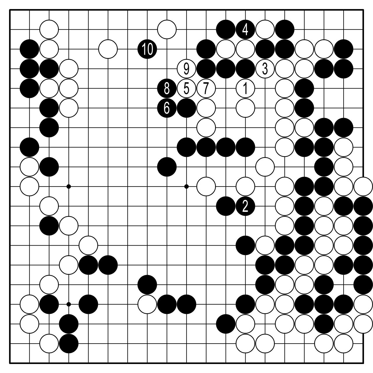 장면⑨=바둑 선수 지망생은 사활 문제를 끊임없이 푼다. 아주 옛날부터 내려온 문제도 풀고 신형 창작 문제도 푼다. 그렇게 많은 훈련을 했지만, 지금과 같은 대형 사활 문제를 만나면 답이 없다. 운에 맡겨야 한다. AI는 살 확률이 조금 높다고 한다. 하나 백1이 대악수다. 3도 마찬가지. 이 순간 백 대마에 소리 없이 비상등이 커졌다. 위쪽에 기사회생의 구명줄이 숨어 있었는데 그게 지워졌다. 펑리야오는 9로 빠져나가면 산다고 믿었지만, 목진석은 흑10의 강수를 준비하고 있었다. 대마의 목숨이 훨씬 위험해졌다.