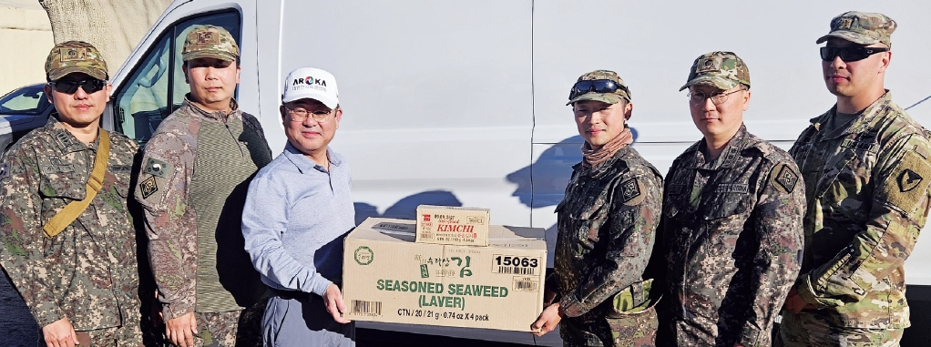 한국 육군협회 미국지회(회장 최만규)는 지난 2일 LA에서 약 150여 마일 떨어진 모하비 사막에 위치한 미 육군 훈련시설 포트 어윈 내셔널 트레이닝 센터(NTC)를 방문해 연합훈련 중인 한미 장병들을 격려했다. 올해는 한국에서 육군 제5기갑여단 북진대대 장병 119명이 연합훈련에 참여했다. 육군협회 미국지회 측은 이날 장병들에게 김치와 라면, 즉석밥, 음료 등을 지원했다. 최만규 회장(왼쪽 세 번째)이 정영민북진대대장(중령)에게 위문품을 전달하고 있다.
