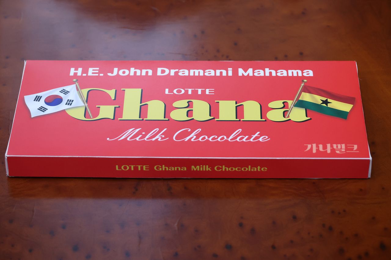 이재명 대통령이 11일 한-가나 정상회담에서 존 마하마 가나 대통령과 기념촬영을 하고 있다. 아래 사진은 이 대통령이 마하마 대통령에게 선물한 ‘가나 초콜릿’. 포장지에 마하마 대통령의 이름과 양국 국기가 인쇄돼 있다. 강유정 청와대 대변인은 “가나는 우리에게 ‘가나 초콜릿’ 제품으로 익숙해져 있는 나라로, 해당 초콜릿은 카카오 원두의 80% 이상을 가나산으로 사용하고 있다”고 밝혔다. [청와대사진기자단·연합뉴스]
