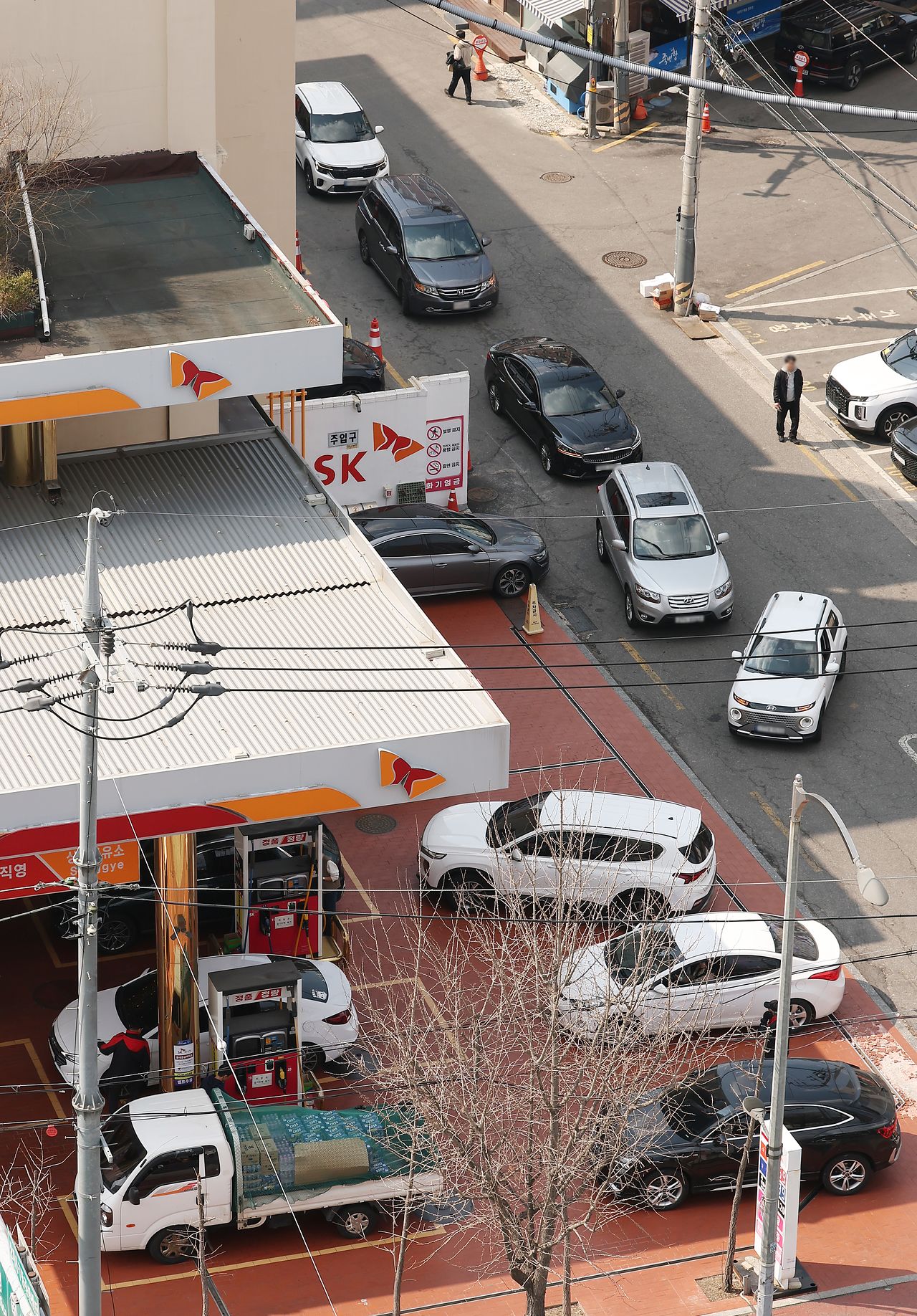 정부가 석유 최고가격제를 검토 중인 12일 서울 노원구 한 주유소에 차량들이 몰려 있다. 이날 한국석유공사 유가정보시스템 오피넷에 따르면 해당 주유소는 오후 2시 기준 보통휘발유 가격이 리터당 1769원으로 서울 최저가를 기록했다. [연합뉴스]