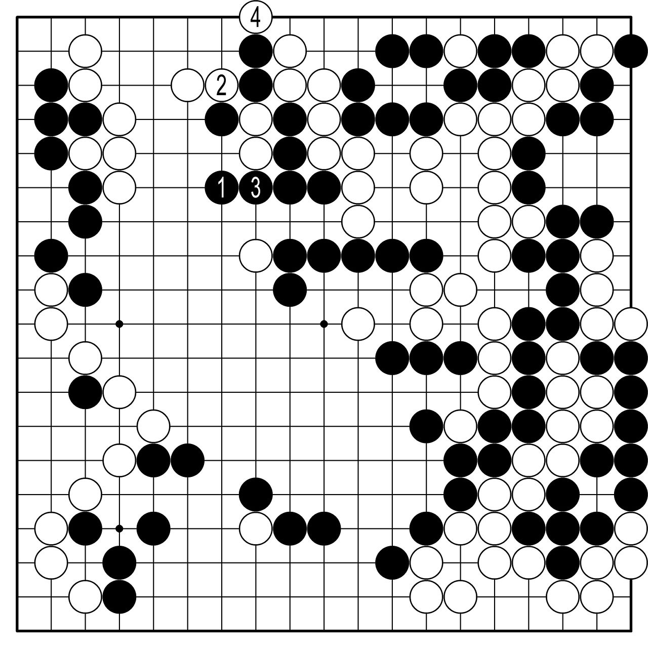 ◆참고도=축이나 장문이 안된다고 했지만 사실 장문이 하나 있었다. 위 그림 흑6으로 이 그림 흑1로 씌우면 장문이 된다. 하나 이건 망하는 길. 백2로 끊으면 흑3으로 두 점을 잡을 수 있지만, 대마가 백4로 살아간다.