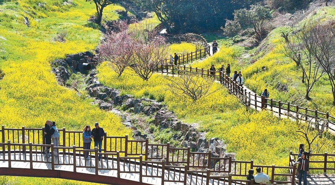 여기저기서 꽃 소식이 들린다. 화려한 꽃망울은 봄의 전령사다. 올해도 어김없이 봄이 우리 곁으로 돌아왔다는 의미다. 한국의 봄은 남녘에서 시작된다. 제주 서귀포시 색달동 엉덩물 계곡에 유채꽃이 활짝 피어 탐방객 눈길을 사로잡고 있다.