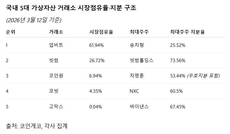 반면 다른 주요 거래소들은 규제 영향을 훨씬 크게 받을 수 있다는 관측이 나온다. 지분율 상한이 20%로 정해질 경우 가장 큰 타격이 예상되는 곳은 빗썸이다. 빗썸의 지배회사인 빗썸홀딩스는 현재 약 73.56%의 지분을 보유하고 있어 단순 계산만으로도 절반이 넘는 지분을 매각해야 하는 상황이다. 다만 특수관계인 지분 인정 범위에 따라 실제 매각 규모는 달라질 수 있다.