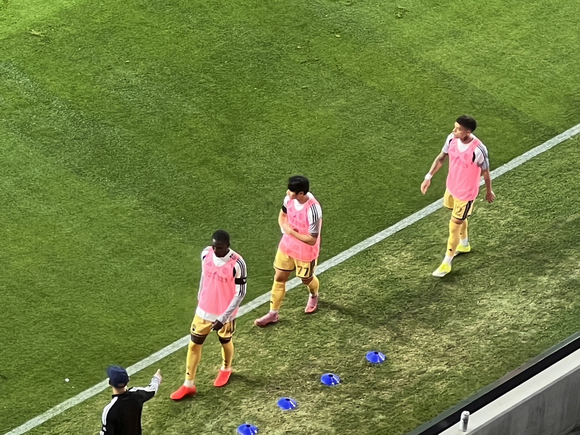 후반 15분, 세인트루이스 시티 SC의 정상빈(오른쪽 두 번째)이 경기를 지켜보며 몸을 풀고 있다.